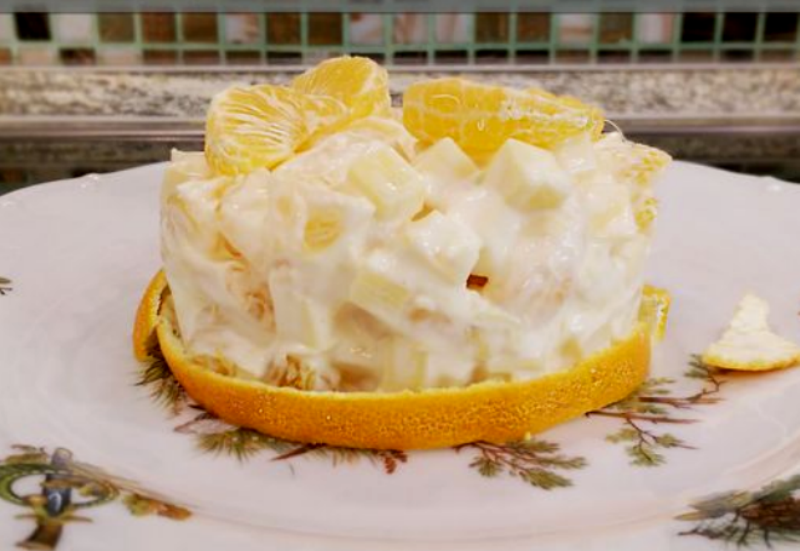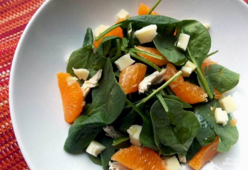 Einzigartiger und einzigartiger Salat von Mandarinen, fester Käse und Knoblauch. Wenn Sie exotisch wollen, werden Sie nicht besser denken.