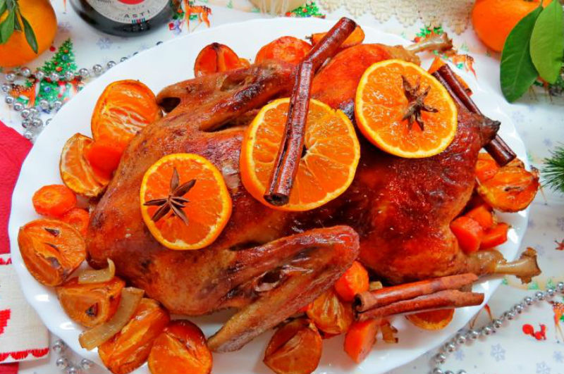 Ente mit Äpfeln ist eine ziemlich bekannte Kombination. Aber auch Mandarine sind ideal für diesen Vogel. Darüber hinaus geben sie dem Gericht einen exquisiten Neujahrsstil.