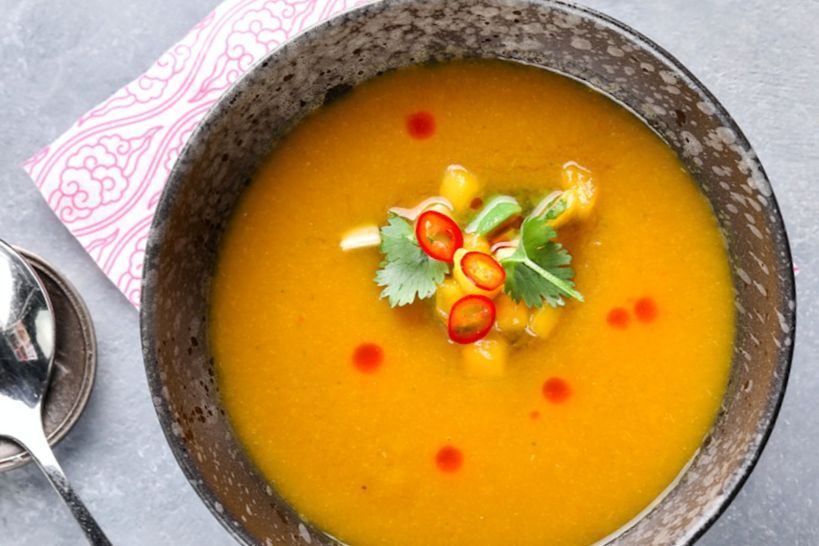 Würzig, erfrischende Gazpacho-Suppe wird Bezug genommen, wenn in seiner Zusammensetzung Avocado enthält. Und die Noten von Ingwer, Minze und Basilika wird eine Spitze Gericht geben.