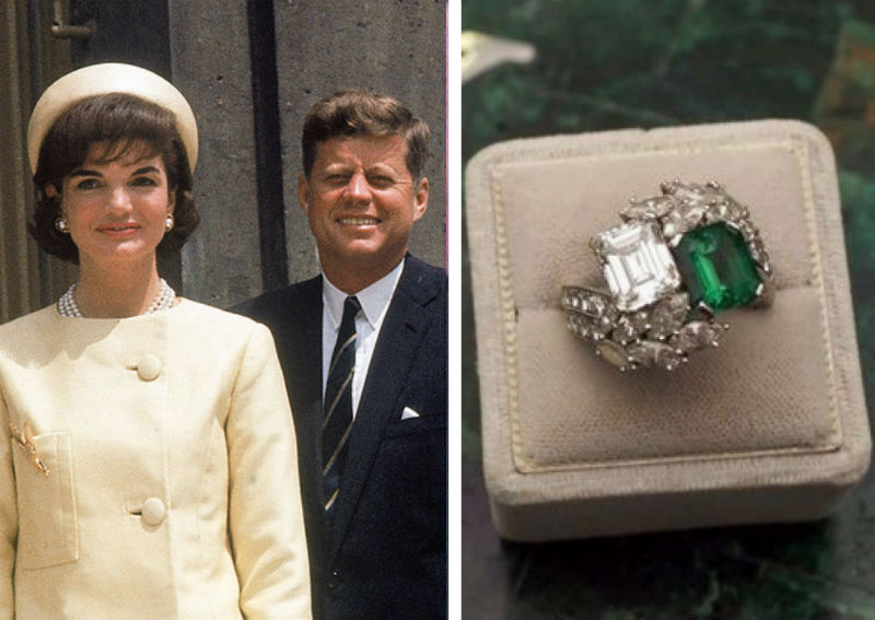 Ein mit einem großer Diamanten, Smaragd und Aussaat von Diamanten, von der legendären Marke Van Cleef & Arpels John F. Kennedy, der 1953 mit einem großen Diamanten, einem Smaragd und einer Aussaat von Diamanten verknüpft wurde, präsentierte 1953 in einem der BOSTON-Restaurants Jacqueline.