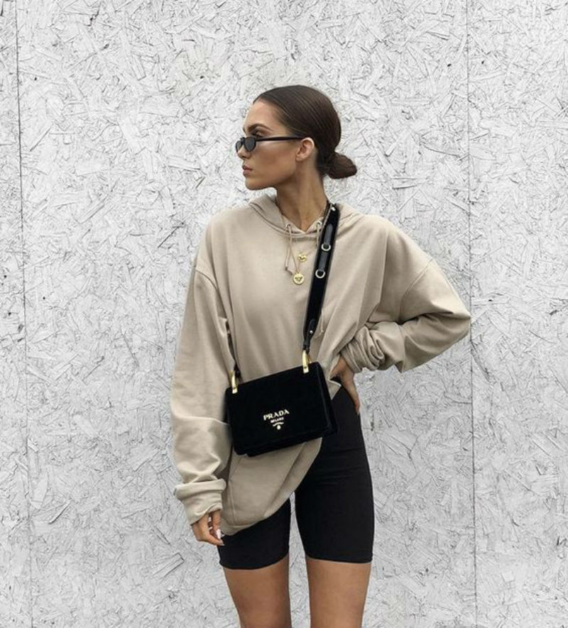 Ein weiterer universeller Soldat. Gepflegte, schwarze Fahrräder können leicht mit Hoodie- oder Überyz-Jacke mit einer anspruchsvollen Bluse oder einem riesigen Baumwoll-T-Shirt kombiniert werden. Sie können das Image komplizieren - an den Rock- oder Kontrastgggings anziehen, wenn Sie Ihre Füße nicht machen wollen.
