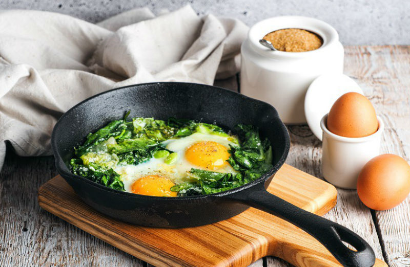 Eine weitere ungewöhnliche Frühstücksoption. Spinat ist perfekt mit Eiern kombiniert. Sie können frische Grüns verwenden, und Sie können - und in der Bank konservieren. Ein solches nahrhaftes und sehr leckeres Frühstück wird Sie lange Zeit mit Energie schütteln.
