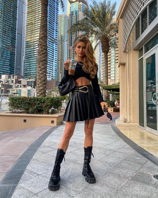 Fügen Sie dem täglichen Bogen Minic Chops hinzu, um dem Mini zu helfen, der in der Kleiderschrank an jedem Fashionista der glamourösen Epoche von Null war. Um die Fahrzeuge der Vulgarität nicht zu bewegen, versuchen Sie, nur einen Teil des Körpers zu berauben. Nun, wenn Sie sich nicht um die Regeln kümmern und mutig aussehen möchten, kombinieren Sie Mini mit modischen Erntegut und Sandalen auf einer massiven Sohle.
