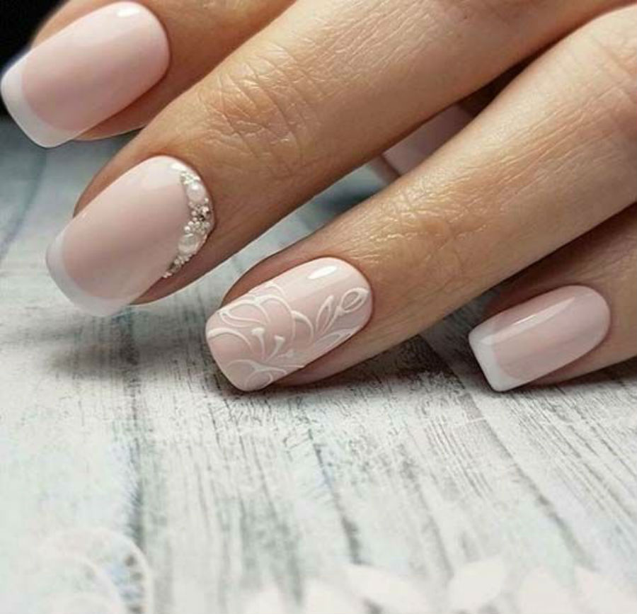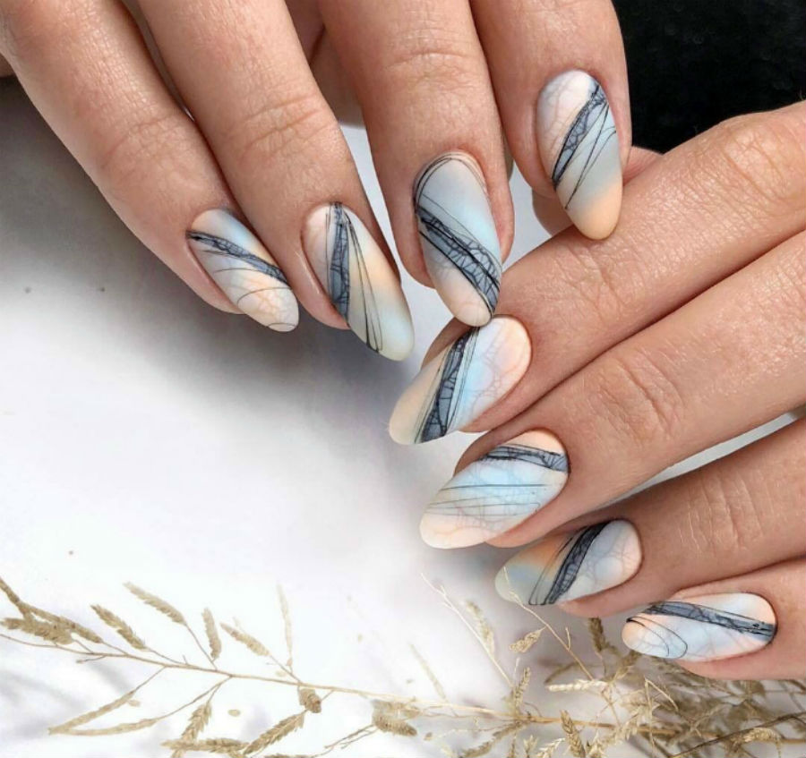 Wahre zarte und Frühlingsmaniküre. Dehnung kann beliebig sein: vertikal, horizontal, diagonal, ab der Mitte des Nagels.