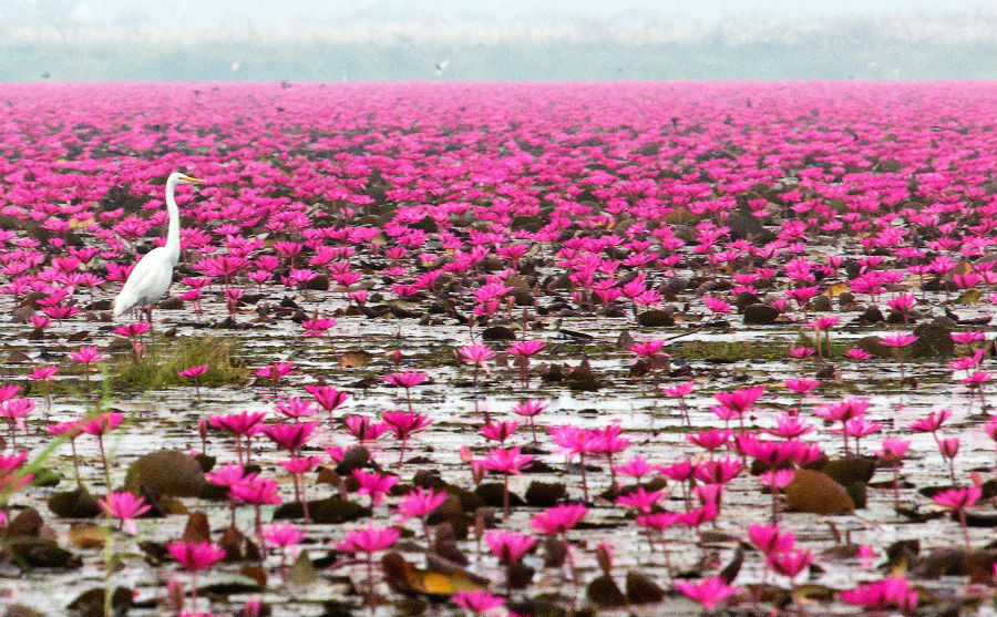 Der rotes Lotussee ist einer der fantastischsten Orte der Erde. Stellen Sie sich ein Der ungewöhnliche See befindet sich im Nordosten von Thailand. Die beste Zeit für die Reise ist von Ende Dezember bis Februar.