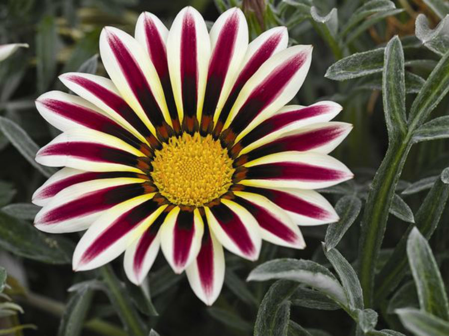 Gazania - sieht aus wie ein echtes Kunstwerk. Ich bin auffallend grafisch, als ob es einfach unter den Händen eines erfahrenen Zeichnungsmanns übrig bleibt. Trotz seiner südafrikanischen Wurzeln lässt sich das Gas leicht auf unseren Weiten verlassen.