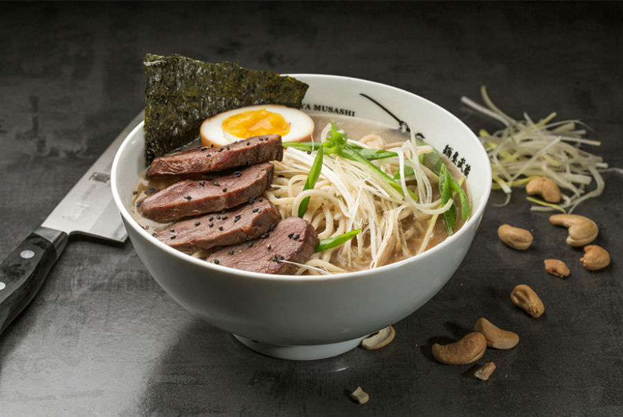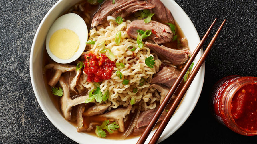 Die klassische Raman Supreme-Suppe wird auf der Grundlage von Schweinefleisch mit dem Zugabe von Weizennudeln, Gewürzen und verschiedenen Gurken hergestellt.