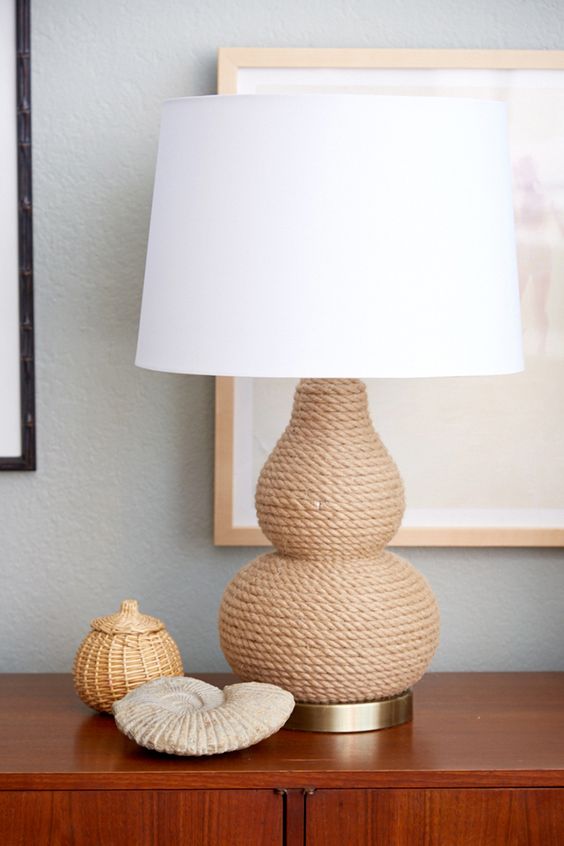 Das Seil ist eines der bemerkenswertesten Materialien, die im Meeresboden verwendet werden. Es ist sehr schwierig, Wege zu finden, um diese Textur in das Haus zu bringen. Beleuchtung ist eine ausgezeichnete Option. Der Zettel kann zum Dekorieren im Freien und aufgehängten Leuchten verwendet werden. Und du kannst es mit deinen eigenen Händen tun. Es stellt sich preiswert und stilvoll aus.
