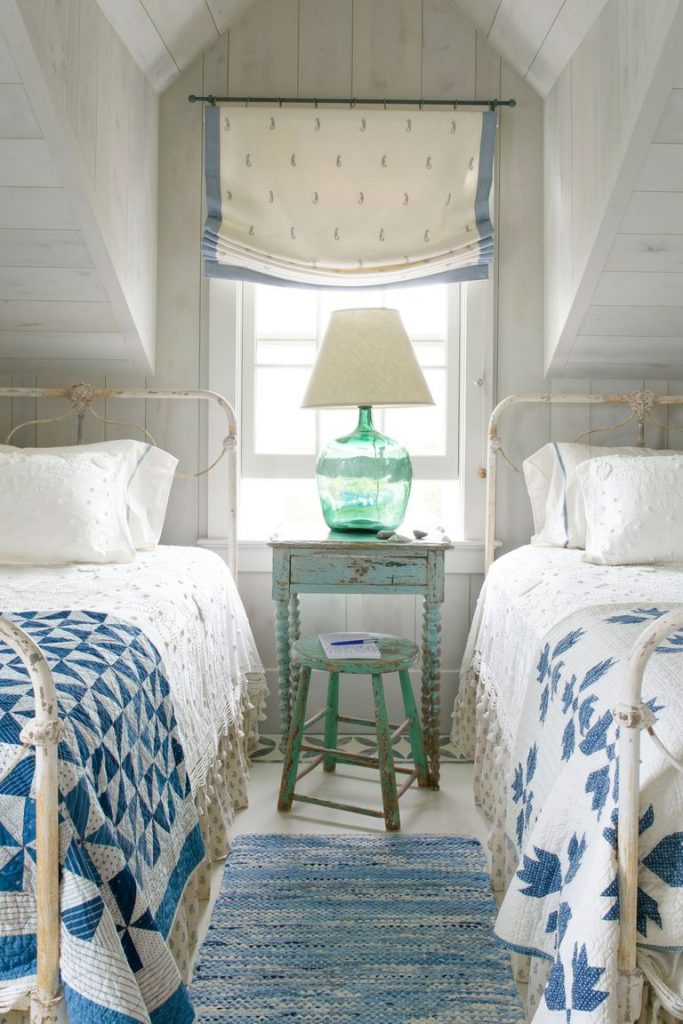 Blau-weißes Farbgamma - die Basis eines beliebigen Marine-Interieurs. Es ist direkt mit den USA mit Meer, schneeweißen Wolken und Segeln verbunden. Natürlich kann es diversifiziert werden. Schlafer Blau, Sandy-Gelb, Koralle, Braun - Dies sind die Haupttönen des Himmels, der Sonne, der Takelte und den Küstensand.