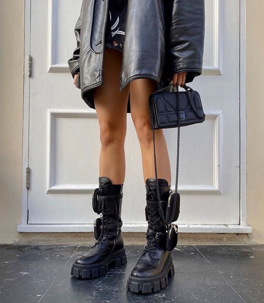 Massive Stiefel und Stiefel - Must-Have-Saison. Es kann auf der Schnürung und auf der Burg sein. Kann absichtlich mit geringem Knöchel stark bedeckt sein. Richtige Oszillage-Ansicht, die sie für Heizungs- und massive Sohlen erworben werden. Auf den Podiumschuhen kombinieren mutiger Schuhe mit einfachen, gestrickten Kleidern, Denim und Overall.