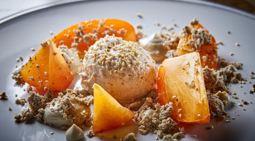 Zarte süße Persimone - ein universelles Früchte. Es kann von einer Köstlichkeit, einem nahrhaften Snack oder einem eleganten Schlitten hergestellt werden. Und wie ist es wunderbar kombiniert mit einer Sutin-Brust oder einem Lamm! Eigenschaften verlieren.