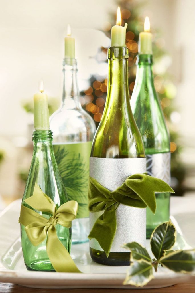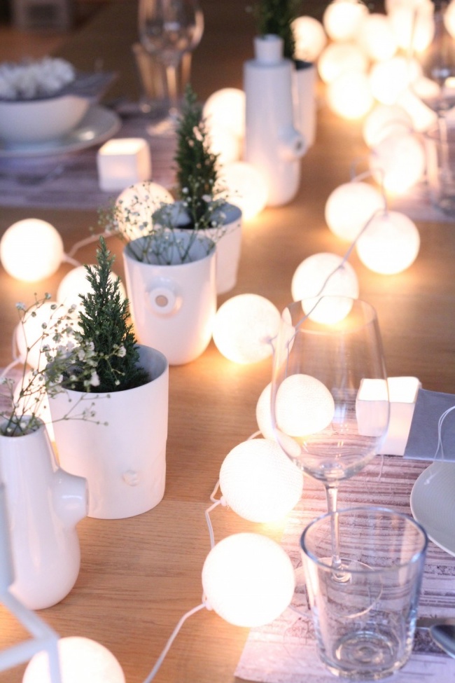 Zarte romantische Stimmung erzeugt Kerzen und Girlanden. Als Kerzenständer ist es möglich, schöne Flaschen Wein und Champagner, Gläser zu verwenden. Es ist froh, Salz zu füllen, um einen Effekt von künstlichem Schnee zu erzeugen.