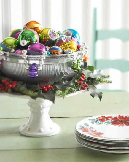 Dies ist die einfachste Ergänzung des festlichen Tischs. Nehmen Sie einfach schön, die Kerler, die Form, um die Kuchen zu backen und mit Weihnachtsbällen mit anderen Dekorationen für Ihren Geschmack zu füllen. Die Zusammensetzung kann mit Alumeln, Früchten oder Zapfen verdünnt werden.