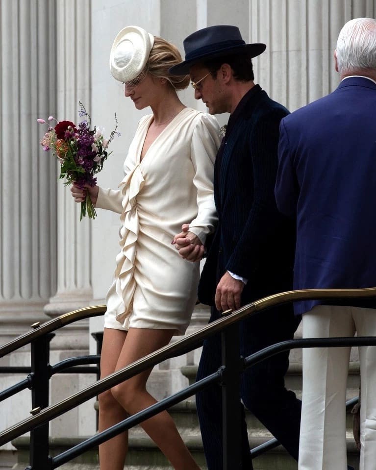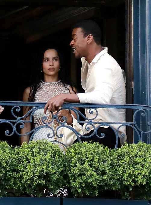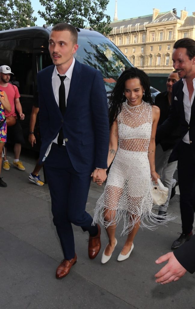 Die Hochzeit Zoe Kravitz und Karlaglusman fanden in Paris in der Luxuriöse des XVIII-Jahrhunderts statt. Für Hochzeitsfeiern wählten ein ziemlich ungewöhnliches Outfit: weiße Ober- und Radsande und von oben - ein Gitterkleid mit Perlen.