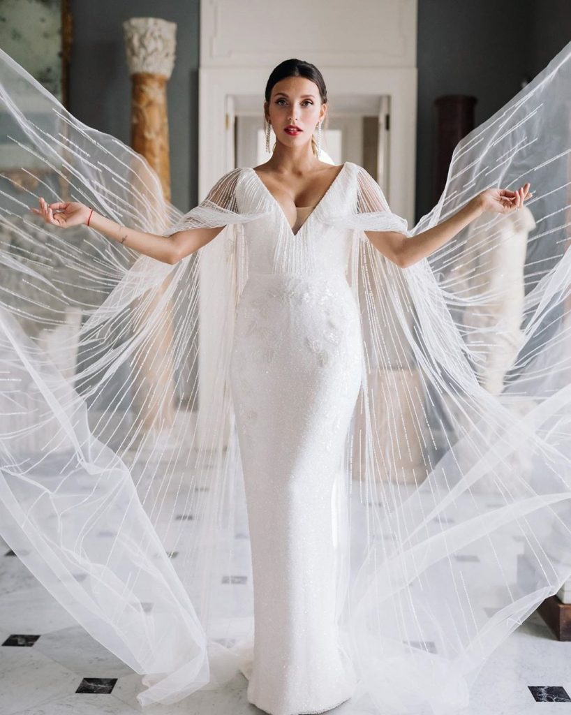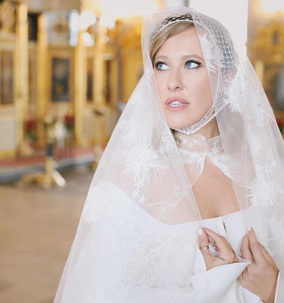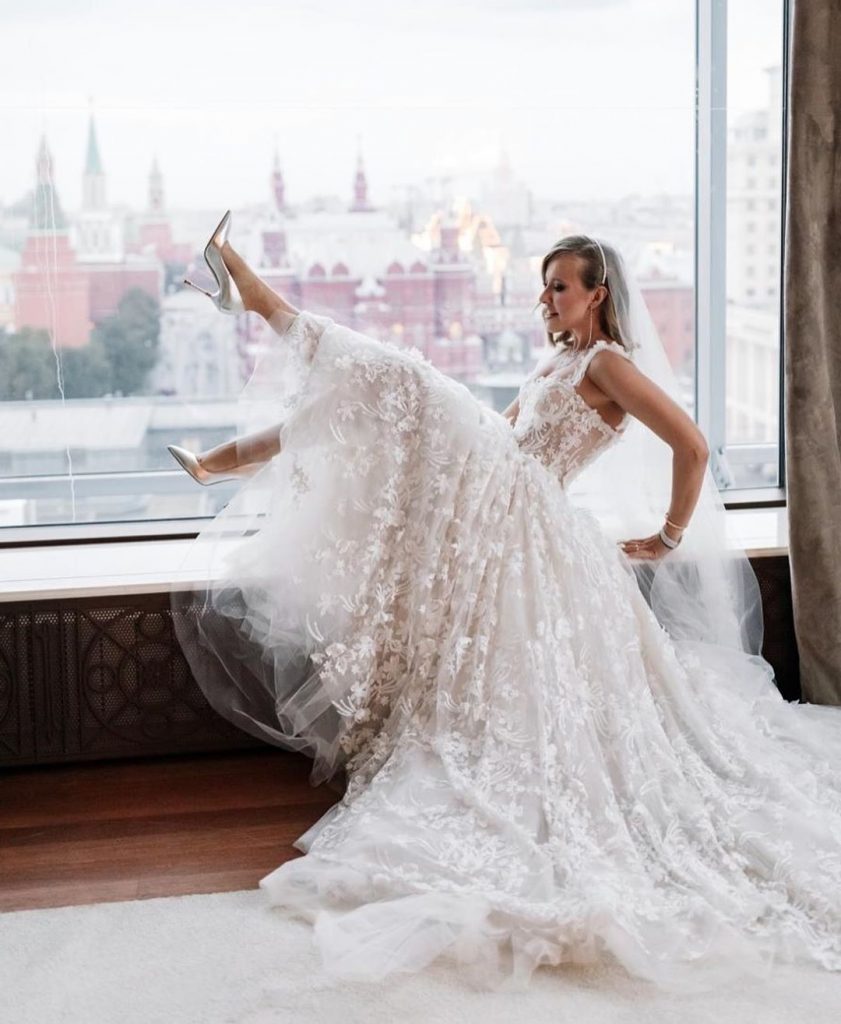 Die Nation der Hochzeitsfeier Kseniasobacchak hat 4 Outfits geändert. Vielleicht das Geeignete, war es seine Hochzeits-Dysfrearski-Marke Ödem Couture. In minimalistischem, glattem, mit einer klaren geometrischen Abstraktion an der Brust und dem Schleier, erweitert. Plus - Originalperlen auf dem Kopf.
