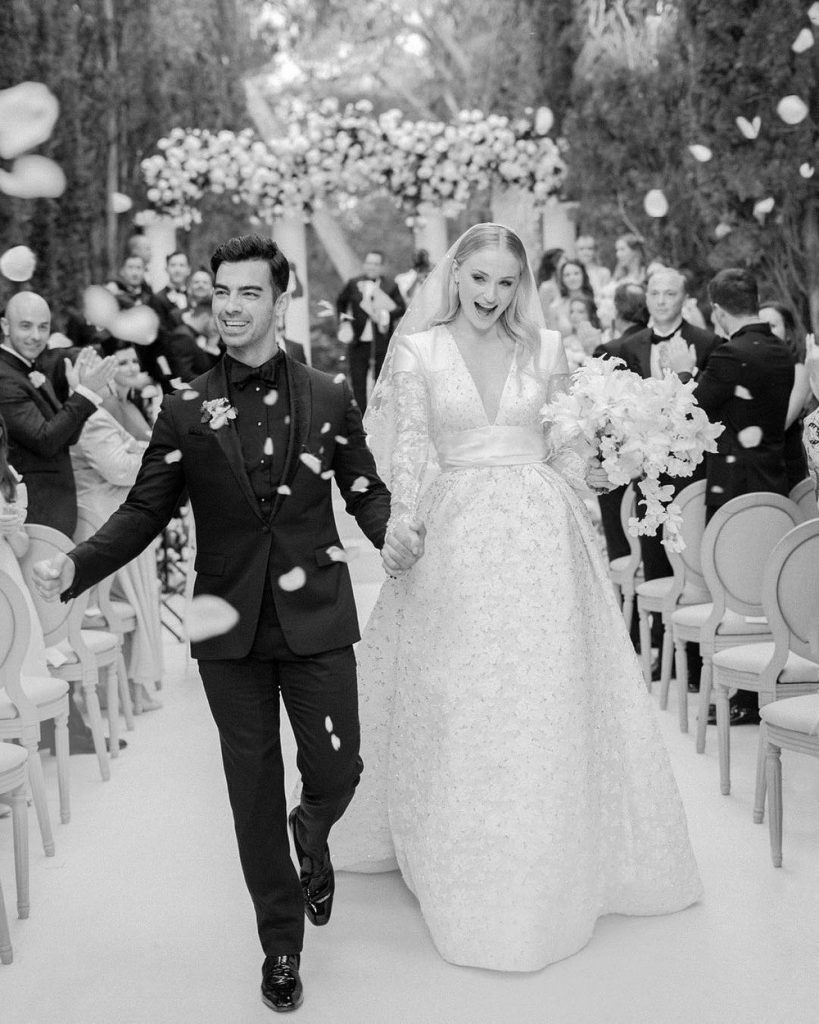 Star "Game of Thrones" Sophie Terner Cepping Hochzeit Feiern üppige Kleider Spitzenärmeln und elegantes Fatah Fashion House Louis Vuitton. Es ist bekannt, dass die Schaffung ihres Kleides 14 Meterstul, 100.000 weiße Perlen und Kristalle nutzte.