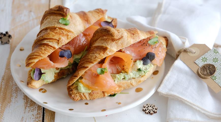 Der Auslöser ist nicht weniger unterlegen des besten Restaurants. Knuspriges Croissant, schwaches Salzforellen, Käsecreme und frisches Gemüse - wahrhaft magische Kombination aus FEEE-Tieren und Faser.