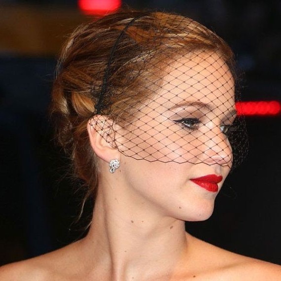 Schleier plus roter Lippenstift -Jennifer Lawrence Er weiß, wie er auf die Partei aufmerksam macht.
