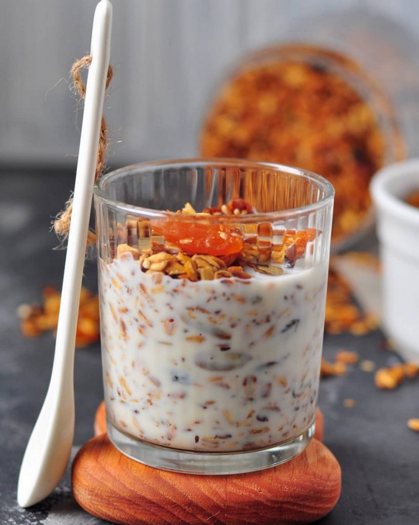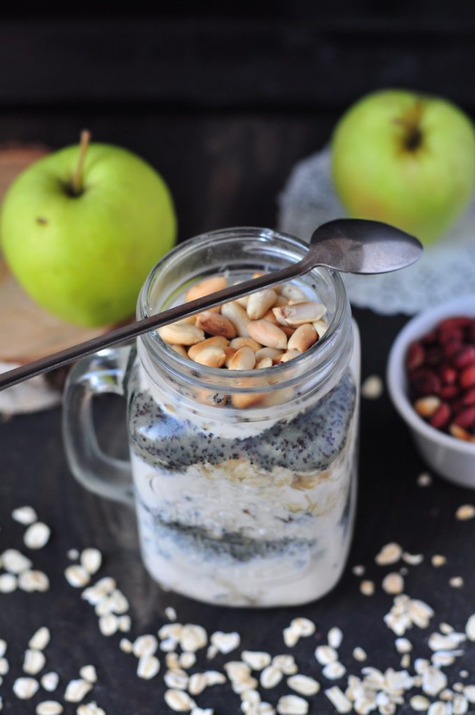 Du wirst brauchen:60 g Haferflocken (langes Kochen), 60 g grüner Tee, 1 TL. Mödag, 100 ml Ryazhenka, ein großer Apfel, 1 EL. Mohn, Rosinen, geröstete Erdnüsse.