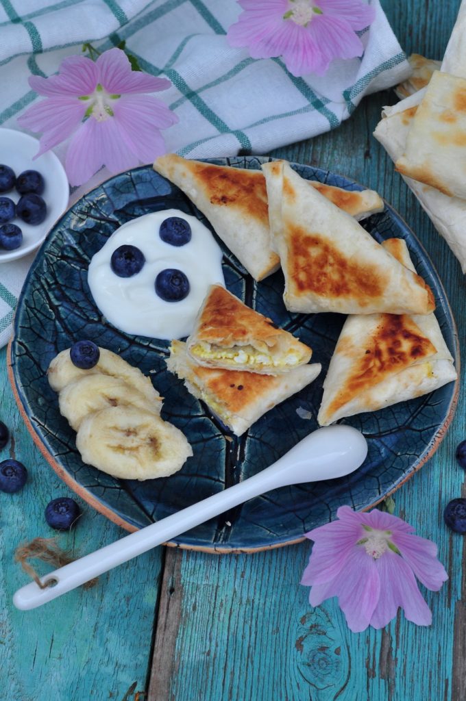 6. Ecken von Pita mit Hüttenkäse und Banane.