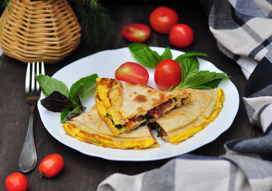 Du wirst brauchen:1 Lavash, 1 Ei, ein bisschen Milch, 1 Tomate, Versiegelung von Spinat und Basilikum - ein paar Zweige, Dill, Butter zum Braten, 20 gr. Festkäse, Salz und Pfeffer zum Geschmack.