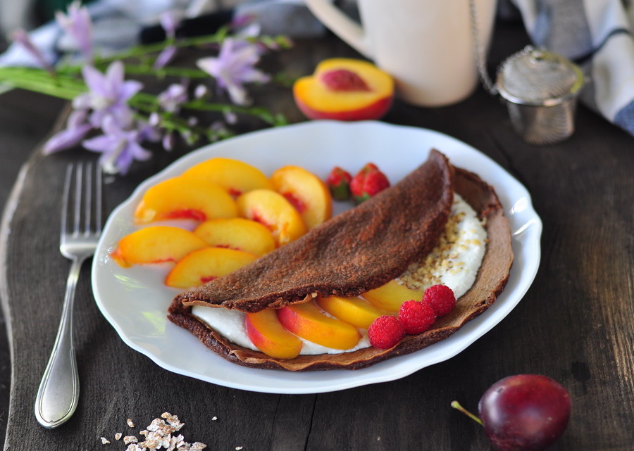 Verbinden Sie alle Zutaten und mischen Sie gut. Bratpfanne vorheizen mit Antihaftbeschichtung. Gießen Sie den Teig in die Pfanne und braten Sie auf beiden Seiten auf beiden Seiten unter dem Deckel auf. Auf dem Pfannkuchen können Sie die Quark- oder Beerenfüllung legen.