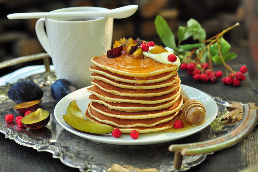 Eier Paare mit Zucker- und Gemüseöl. Umrühren, um Zucker aufzulösen. Milch hinzufügen. Mühle fragen nach einem Bremslager und treten allmählich in den Teig ein. Bis zur Einheitlichkeit rühren. Fry-Pankeepers auf mittlerer Wärme von zwei Seiten, um runden Pfannkuchen zu bilden. Beim Füttern mit Honig und Dekorieren von Beeren.