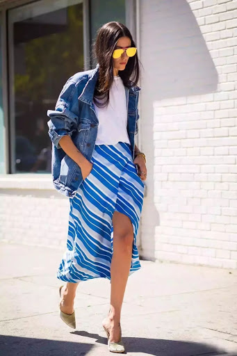 Maxi Long-Kleider werden empfohlen, mit kurzen Modellen der Denim-Jacken zu kombinieren. Es ist besser, dass die Jacke unter die Taille fällt. Obwohl für fragile Mädchen, ist jede Option relevant.