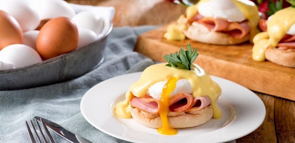 Sharpect das Brot in den Toaster. Top von Put-geröstet Stücke Speck oder Schinken. Fertige pashot Eier legen sich über den Toast mit Speck. Servieren Sie ein Gericht mit einer warmen dutch Sauce, hergestellt aus geschmolzener Butter, Hühner Eigelb und Zitronensaft.