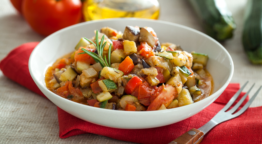 Nehmen Sie Zwiebeln, Auberginen, Paprika, Zucchini und Tomaten. Schneiden von Gemüse in kleinem, den gleichen Größe Würfel. Finger sie in einer Pfanne mit Knoblauch und Thymian Zweige. Wenn Gemüse verdrillt sind, mit Salz, Zucker, Zitronensaft, Pfeffer und schalten bei schwacher Hitze 5-7 Minuten. Sie können heiß und kalt servieren, wird es ebenso köstlich sein!