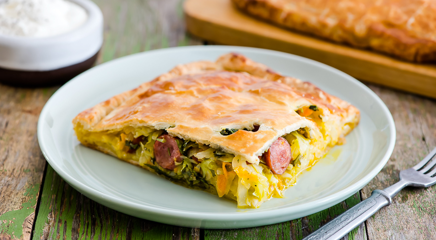 Schneiden Sie den Kohl und legen Sie es auf der Pfanne heraus. Fulk es Karamellfarbe. Dann fügen Sie fein geriebene Karotten, Zwiebeln, Knoblauch und Stücke von geräucherten Würsten. Schauen Sie sich ein paar Minuten. Rollen Sie zwei Schichten fertigen Blätterteig. Legen Sie eine Schicht auf dem Backblech, füllen Sie es mit Füllung. Die obere Abdeckung mit einer zweiten Teigschicht. Schmieren Sie die Torte mit Ei und backen 30-40 Minuten im Ofen bei einer Temperatur von 180-200 °.