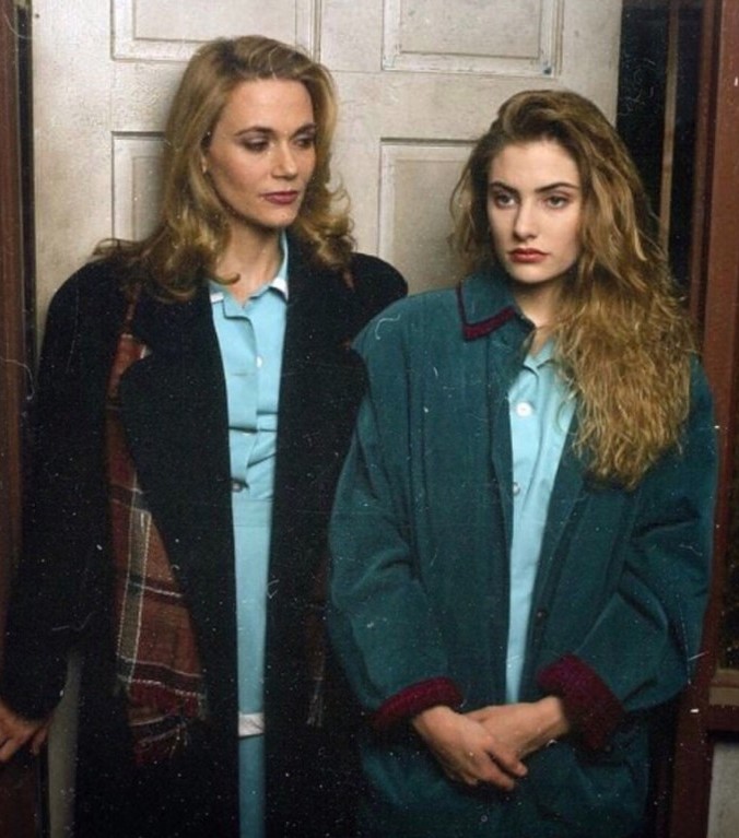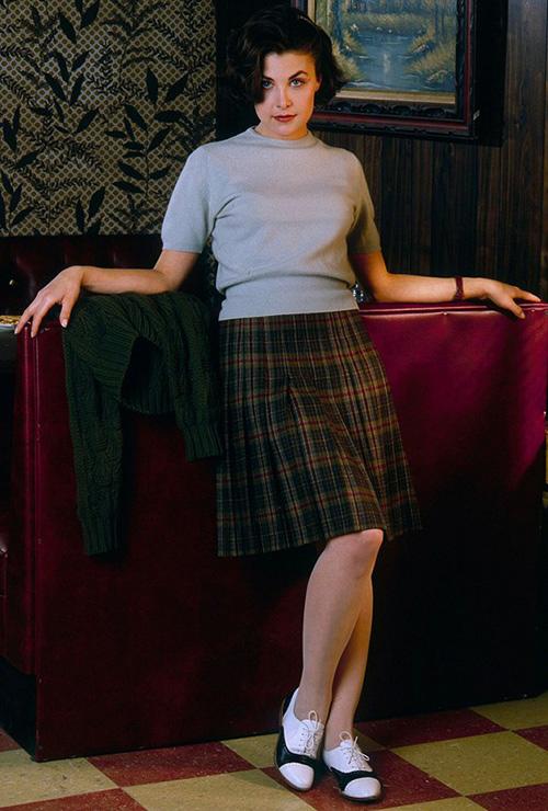 Die andere, mehr reserviertere und lakonische Seite der Mode-90er Jahre zeigt die Charaktere der Kultreihe "Twin Pix". Volumenschichten und Trümmer, Gräben mit absichtlich breiten Schultern, gemütliche Strickpullover mit einem bizarren Druck, lakonisch gestrickter Pullover mit einem dichten Rock in einer Falte. Solche minimalistischen und bescheidenen Outfits gaben den Chief Heldines "Twin Pices" Mysterium und Charme.