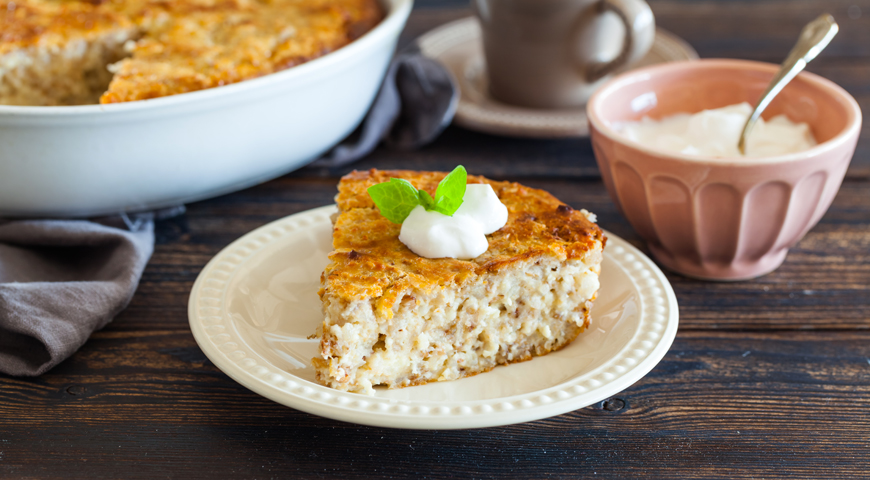 Zucht - so etwas wie Kasserolle aus Buchweizen Getreide mit Hüttenkäse gebacken. Dies ist ein echter Klassiker der russischen Küche. Perfekt für Frühstück und Abendessen geeignet.