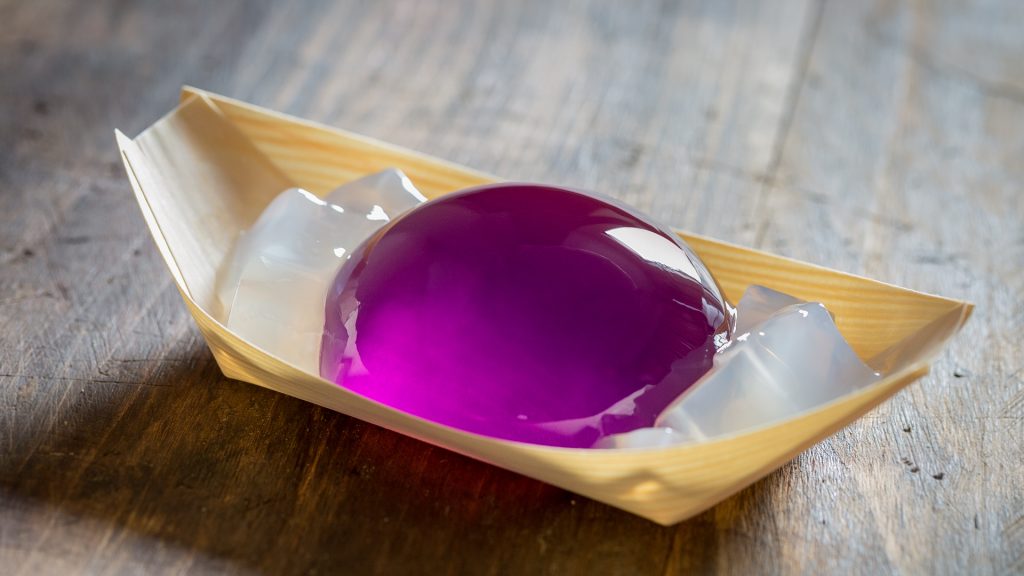 Der Regentropfenkuchen ist ein süßes Gelee von Agar-Agar, der äußerlich einem großen Wasserkugel ähnelt. Dessert ist sehr schön. Es wird normalerweise mit gebratenen Soja kombiniert. Sie können jedoch jede Füllung verwenden, was Sie wünschen. Es kann Früchte, Lieblingsbeeren oder sogar essbare Blumen sein. Sie können den kleinen Kuchen mit natürlichen Farbstoffen experimentieren und dekorieren. Der Fall ist deine Fantasie!