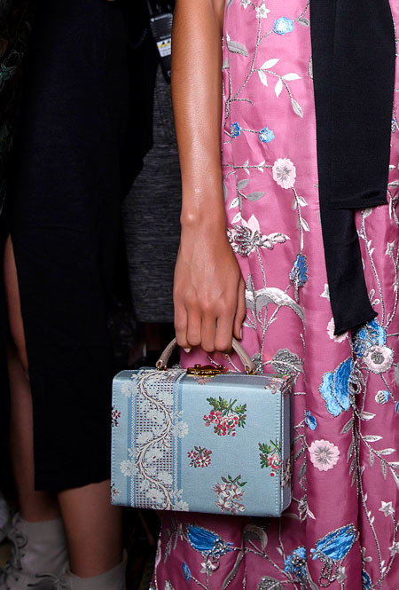 Geometrische Taschen, die der Form einer Miniaturkoffer sehr ähnlich sind - eines der Hauptzubehör des Sommers. Wunderbarer Fund für Retro-Stil-Fans. Mit einem solchen Koffer können Sie zur Arbeit gehen, und zur Party.