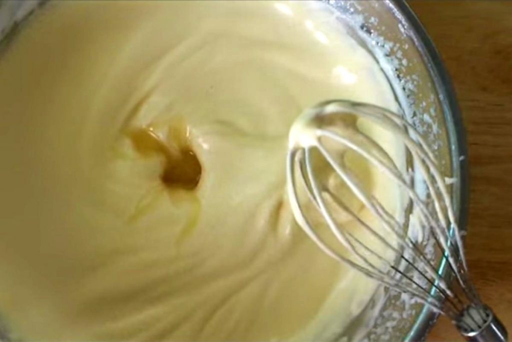 Einer von einem füge Eigelb an die Proteinmasse hinzu. Rühren Sie alle mit einer Klinge mit kreisförmigen Bewegungen in der gleichen Richtung wie Proteine. Es ist wichtig. Proteine werden sahne und leicht seidig.