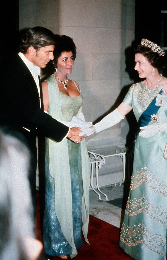 Elizabeth Taylor begrüßte die Königin, die in einem Gradienten Aqua gekleidet ist.