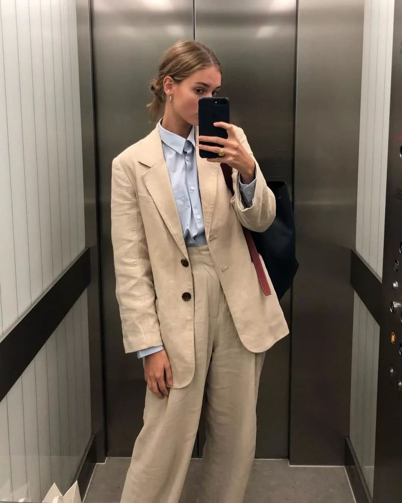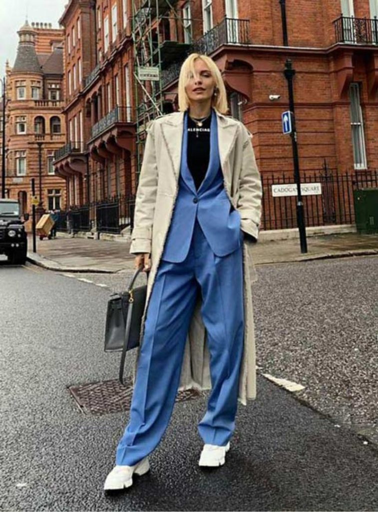 Mit einem klassischen Anzug schaut unglaublich stilvoll mit einem Okoholmantel. Besser, wenn es der gleiche Farbton ist. Der letzte Barcode ist Schuhe und Tasche in kombinierter Farbe.