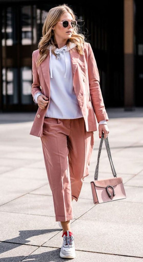 Hoody kann leicht in den Geschäftsstil eingetragen werden. Wenn Sie den Komfort und den "Entspannung" schätzen, wird ein solches Spiel in den Kontrasten nur Ihre Hand spielen. Vergessen Sie jedoch nicht, dass das Kostüm volumetrisch sein sollte, so dass Hoodies organisch in das Bild passen.