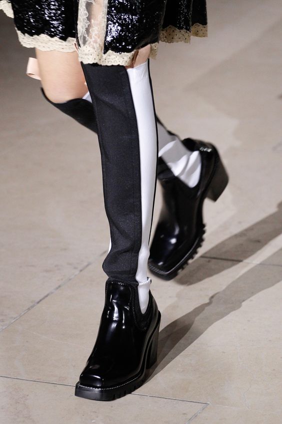 Einzelne Schuhe mit kontrastierender Einlage - eine großartige Möglichkeit, auf Ihre schlanken Beine aufmerksam zu sein. Solche interessanten Modelle im Sinne der eklektischen 80er Jahre sind perfekt mit Röcken und leeren Blastern, fliegenden Kleidern direkt unter den Knien kombiniert.