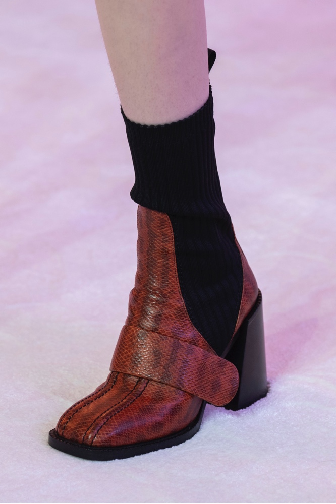 Und dieser Trend kehrte uns dank der Kochbegeisterung der Designer der Mode der Ära der 90er Jahre zu uns zurück. In der neuen Saison achten Sie mutig auf die Engekugeln und den Knöchelläden mit einem geometrischen Kap. Das ungewöhnlichste Lesen dieses Trends ist Stiefel mit einer abgerundeten Nase auf einem Gummi, quadratischen Sohle. Ungewöhnlich - aber es ist sehr praktisch, besonders wenn Sie unter den Füßen stürzen und schmutzig sind.
