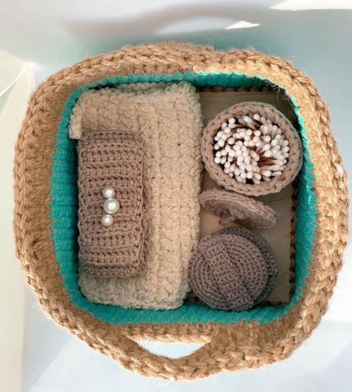9. Geschenkkit für persönliche Hygiene: Handtuch, Korborganisator für Kosmetika, Schlafmaske, Stirnband.
