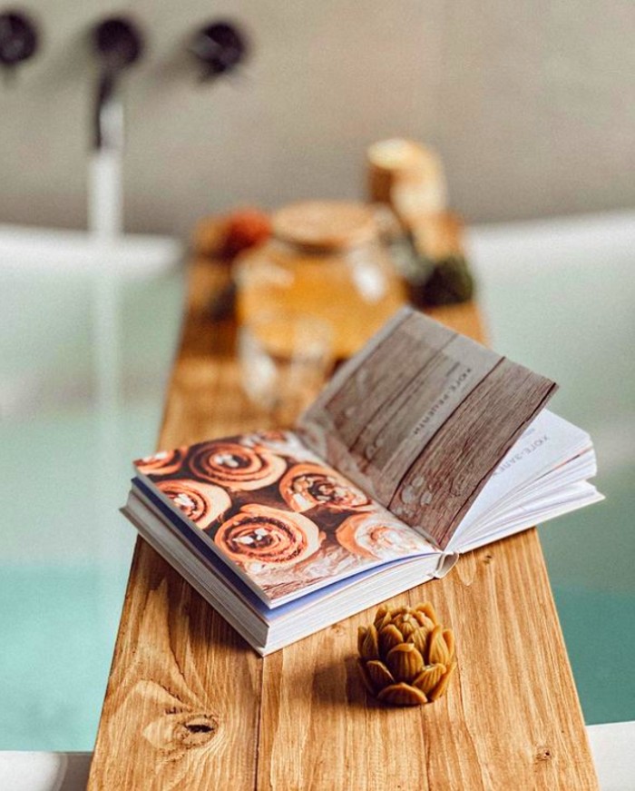 5. Badetisch mit wasserdichter Beschichtung, um Haus-Spa-Verfahren zum Ansehen eines Films und eines Glasweins anzuordnen.
