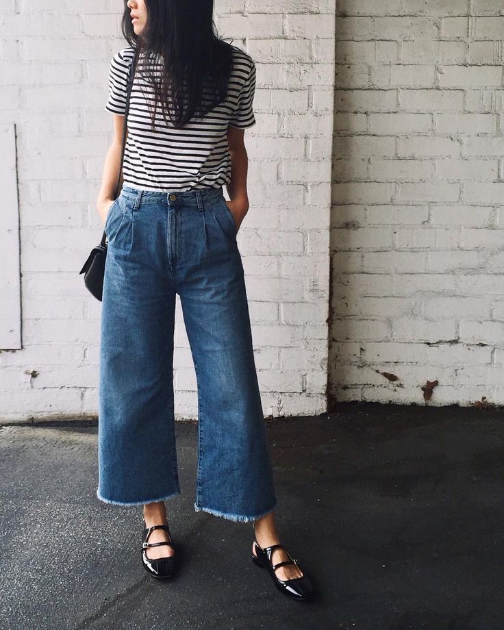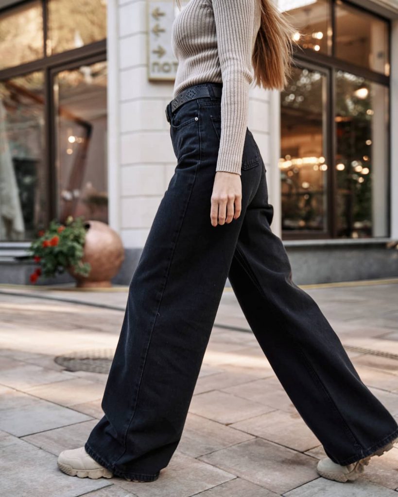 Anna Wintern, Chefredakteurin des American Magazine Vogue, namens Palazzo Jeans den wichtigsten Trend der kommenden Saison. Diese Jeans zeichnen sich durch sehr voluminöse und breite Hosen aus. Die gute Nachricht ist, dass ein solcher Stil absolut für jede Form ausgewählt werden kann. Der Palazzo ist gut, die Tatsache, dass es angemessen ist, eine Atmosphäre anzusehen. Sie können getragen werden, "und im Fest und in die Welt", wie sie sagen, wie sie mit einem Baumwoll-T-Shirt oder einem teuren Kaschmir-Jumper kombinieren. Mit Palazzo ist es besser, an der Regel - enge Oberseite, freier Boden zu haften. Vergessen Sie daher nicht, Hemden und Jampers in Jeans nachzufüllen. Schuhe können auch so unterschiedlich wie möglich sein: Turnschuhe auf einer massiven Sohle, Schuhe auf einer Ferse oder einem flachen Lauf.
