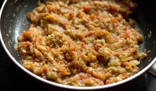 Die Aubergine schälen Sie sich Roamed und geschält, dann gibt es Salz und Gewürze in Zwiebeln, grüne Chilische, grüner Koriander und Geschmack. Dies ist ein beliebtes indisches Gericht, das die Leute gerne mit Arhar-Impulsen und Reis essen.