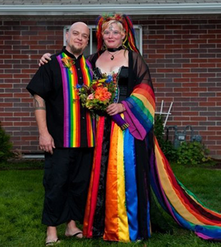 Normalerweise ist das Kleid weiß und elegant? Aber diesmal ist das Design des Hochzeitskleides mit schwarzen dominanten Farben bunt, wir haben es genanntRegenbogen im Dunkeln. Obwohl das Design des Hochzeitskleids ziemlich seltsam ist, aber die Gesichter der beiden Bräute sehen wirklich glücklich aus. Vielleicht, weil die Prozession ihrer Blindheit fertig war, konnte er sofort sein Hochzeitskleid entfernen.