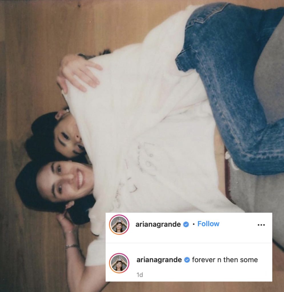 Am 20. Dezember wurde Ariana auf ihrem Instagram gepostet. Mit einer Kapazität, die "für immer und diejenigen", dass das erste Bild ein Bild mit ihrer Schaufensterpuppe scheint, aber wenn wir zum nächsten Bild wechseln, müssen zusammen schockiert werden, wenn es ein Diamantring an ihrem schönen Finger ist, ist es die Ankündigung ihres offizielles Engagement. Inmitten der Glückwünsche von ihren Freunden, sowohl in der Branche als auch in der Außenin der Branche