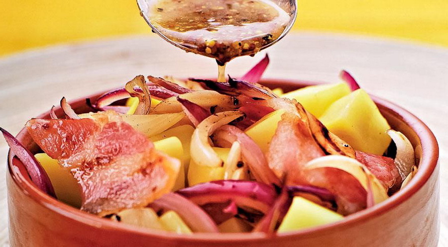 Deutsche Potatosalat wird praktisch sofort gegessen! Es besteht aus Zutaten, die die Küche sind. Diese Kartoffel, geräucherte Brust, Knoblauch, Apfelessig, Senf, Petersilie, Salz und Pfeffer. Versuchen!