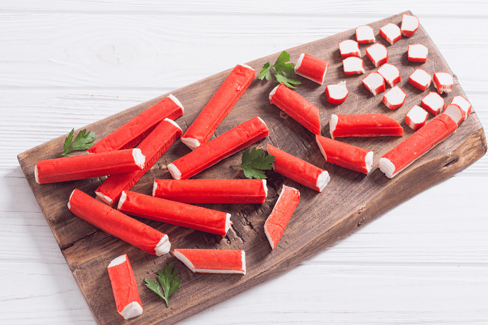 Leider ist in Krabbenstangen und Krabbenfleisch leider nicht viel gemeinsam. Manchmal werden Krabbenstangen nicht einmal aus einem Fischfilet gemacht. In der Zusammensetzung von Krabbenstangen können Sie jedoch genau Stärke, Gemüseprotein, Eier, viele Zucker und Aromen finden, also empfehlen wir Ihnen, ein solches Produkt aufzugeben.