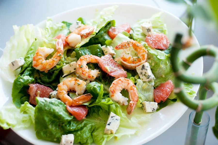 Exotischer und nahrhafter Salat. Nur Protein, frisches Gemüse und Früchte. Nehmen Sie Salatblätter ein. Dies kann jeder frische Salat mit einem neutralen Geschmack sein: Mash, Baby-Spinat, ein Eisbergsalat. Käse mit Form in Stücke. Gefrorene Garnele legen in kochendes Wasser ein, dann Wasser ablassen und kühlen und die Garnelen reinigen. Grapefruit Reinigen Sie die Schale und die Filme und brechen in Stücke. In diesem Salat gibt es auch Muscheln oder marinierte Calamar-Ringe. Tanken vorbereiten: Mischen Sie 2 TBS-Olivenöl, 1 EL-Zitronensaft, Salz und Pfeffer. Mischen Sie alle Zutaten und Wassersalat.